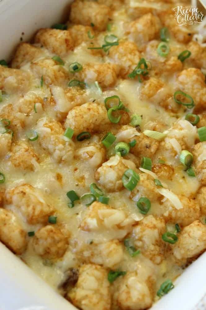 An easy breakfast casserole filled with breakfast sausage, eggs, pepperjack cheese, green onions and tator tots!