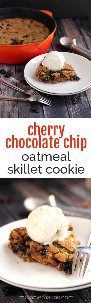 A deliciously easy, one dish Cherry Chocolate Chip Oatmeal Skillet Cookie. An oatmeal cookie base is studded with sweet, dried cherries and chocolate chips. When baked until just set, you end up with a gooey, melty, amazing slice of goodness.