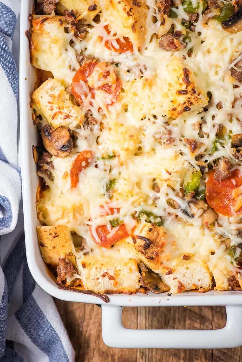 This Easy Pizza Casserole recipe is loaded with marinara sauce, pepperoni, sausage, and green pepper layered with cheesy toasted garlic bread. Your whole family is going to love this quick weeknight casserole!
