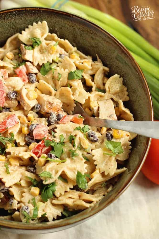 A creamy pasta salad filled with grilled chicken, black beans, corn, tomatoes, green chiles, cilantro, green onions, and Mexican spices.